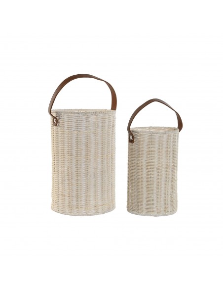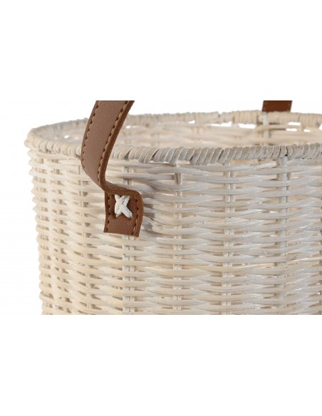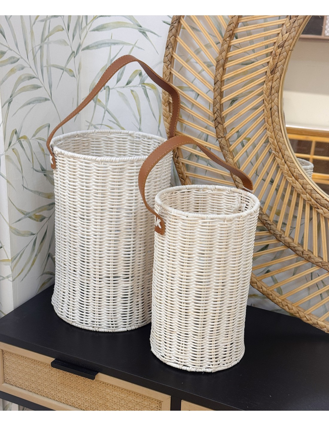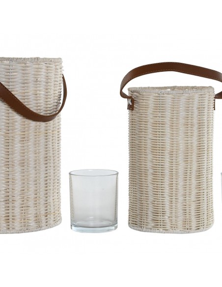Encantador portavelas cilíndrico de ratán blanco con asa de polipiel en tono cuero y vaso de cristal interior.