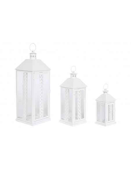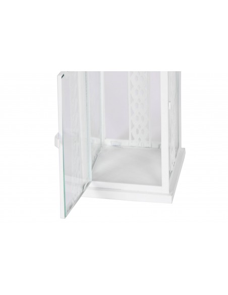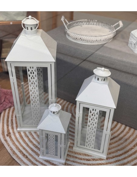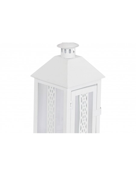 Farol de metal de color blanco. Ideal para el interior o exterior de tu hogar. Se le puede añadir una vela para que aporte luz o simplemente como elemento decorativo. Cuenta con detalles que le aportan originalidad.