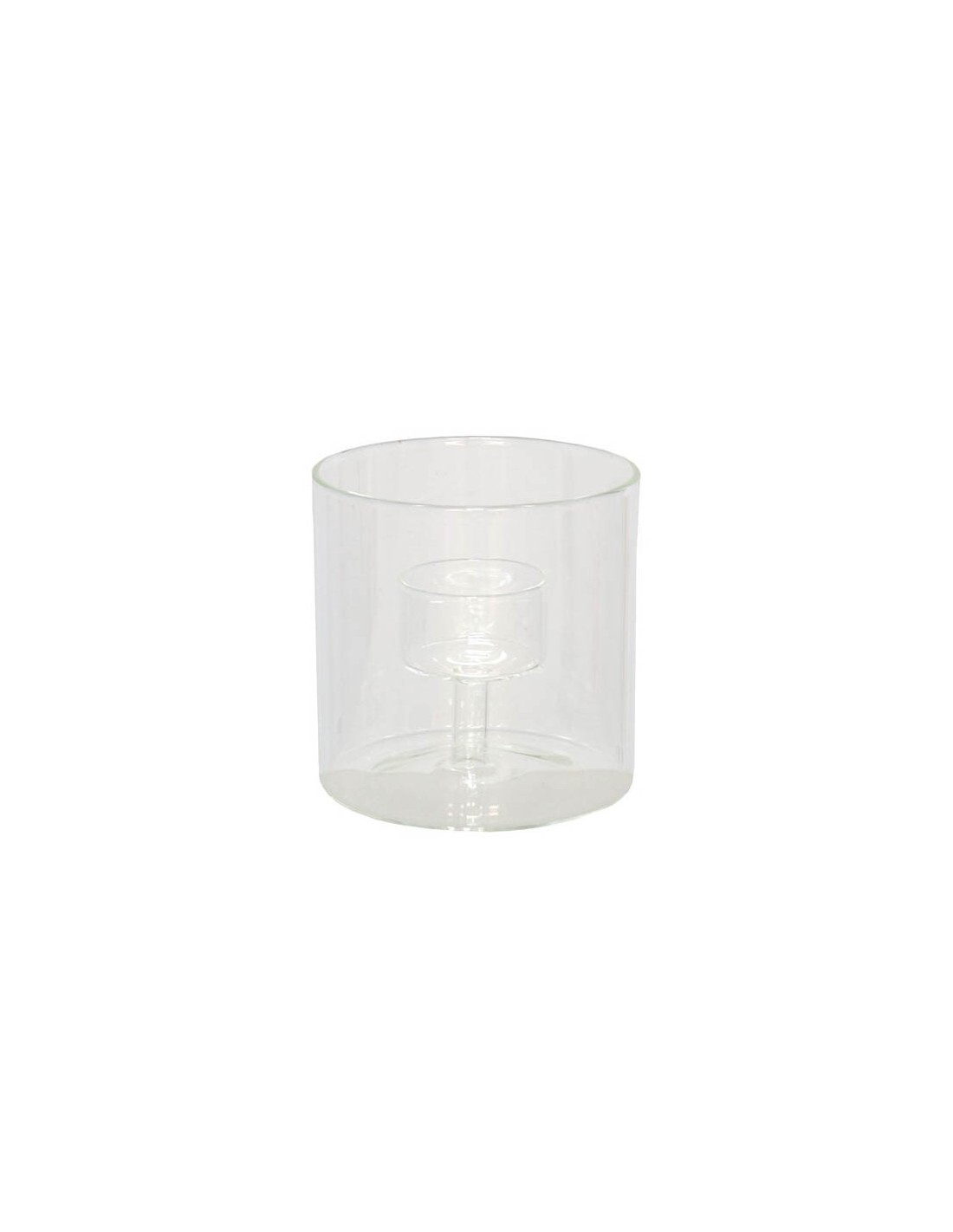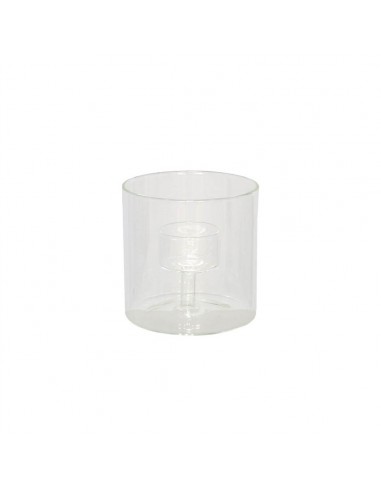Sencillo portavelas de cristal en forma cónica con el pequeño portavela apra vela de té en su interior. Un complemento perfecto para hacer bonitos centros de mesa y dar una cálida luz a una romántica cena.
