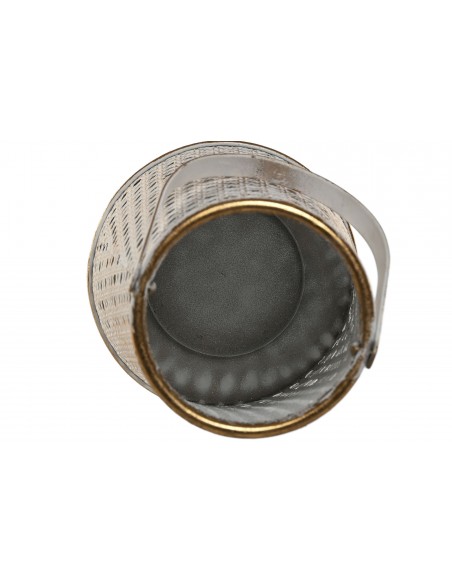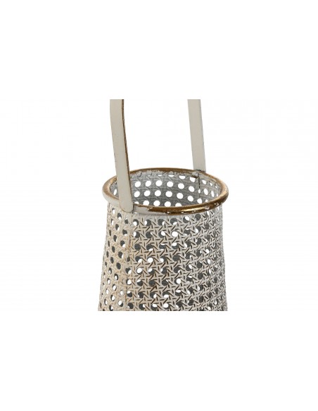 Precioso farol portavelas de metal con un diseño calado estilo cannage en color blanco con toques dorados.