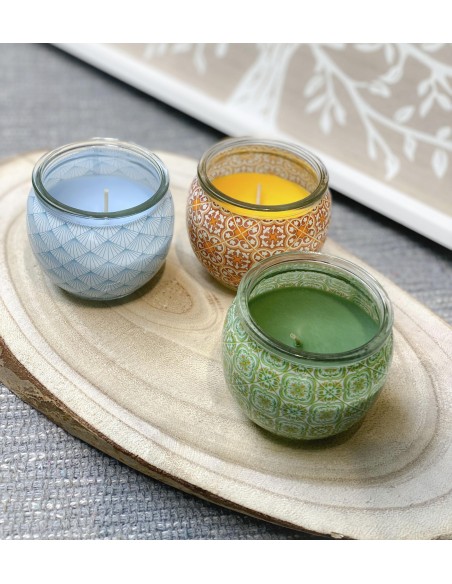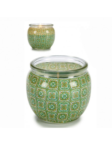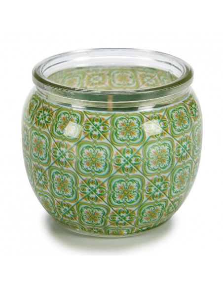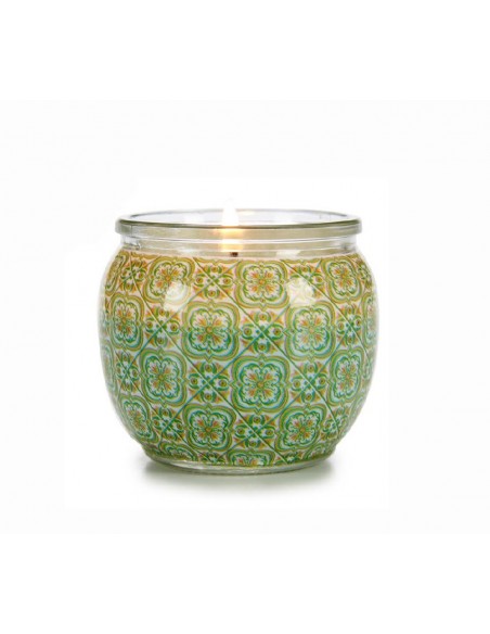 Vela con fresco aroma de gengibre de lima presentada en un bonito vaso de cristal decorado.