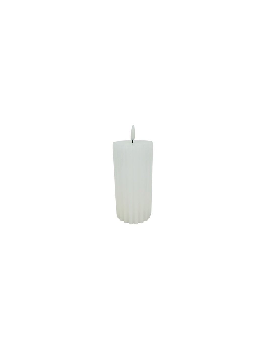 Vela decorativa con luz LED y acabado estriado, diseñada con efecto llama oscilante que imita el parpadeo natural del fuego.