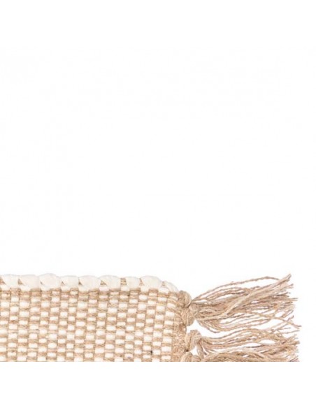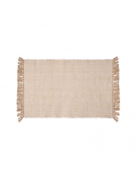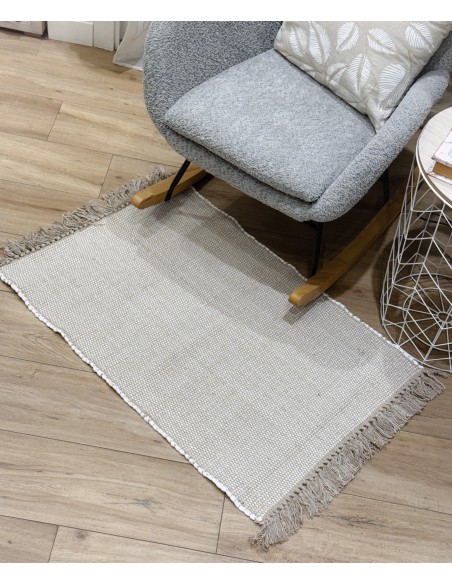 Alfombra rectangular tejida en color beige con detalle de flecos en los extremos, ideal para dar un aire acogedor y natural a cualquier rincón.