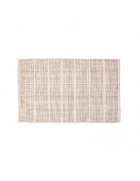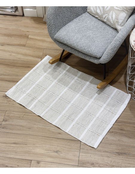 Alfombra rectangular en tono beige con diseño de cuadros tejidos, elaborada en 75% algodón y 25% poliéster.