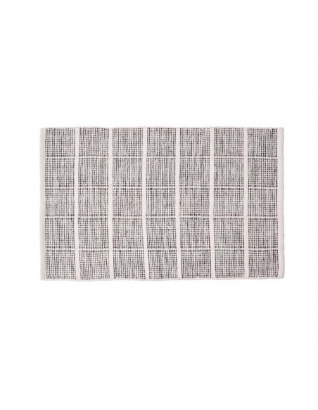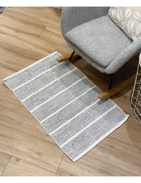 Bonita alfombra rectangular en tonos grises con diseño de cuadros sobre fondo blanco, ideal para dar un aire actual y acogedor a tu hogar.