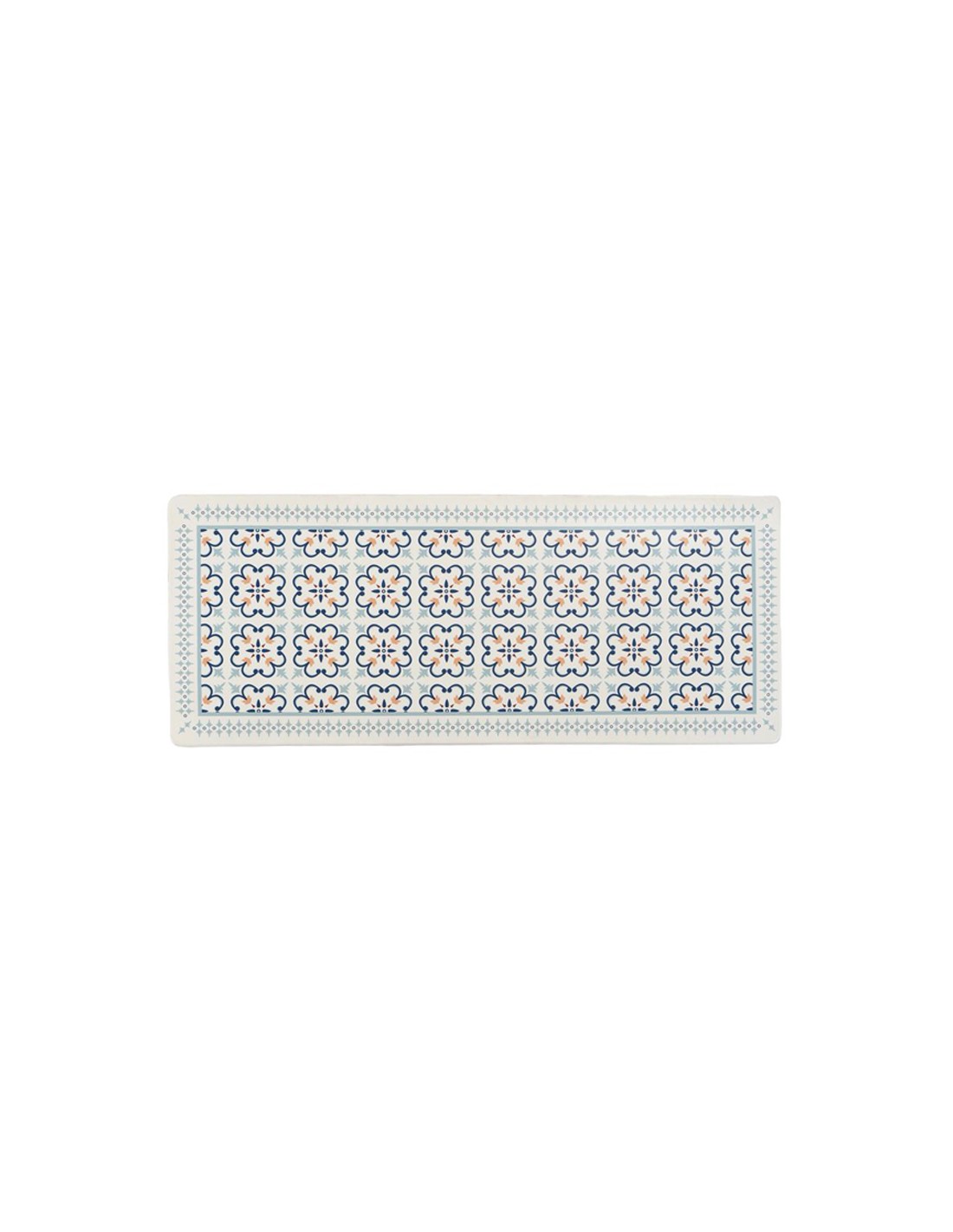 Bonita alfombra de cocina con diseño de flores tipo mosaico, en tonos azules, blancos y detalles suaves que evocan el estilo mediterráneo.