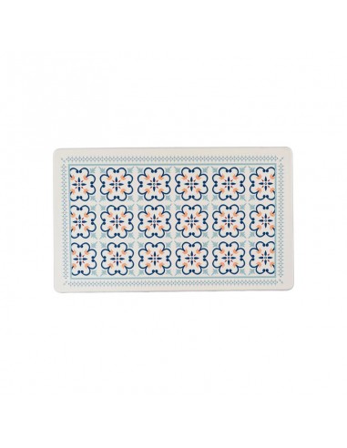 Bonita alfombra de cocina con diseño de flores tipo mosaico, en tonos azules, blancos y detalles suaves que evocan el estilo mediterráneo.