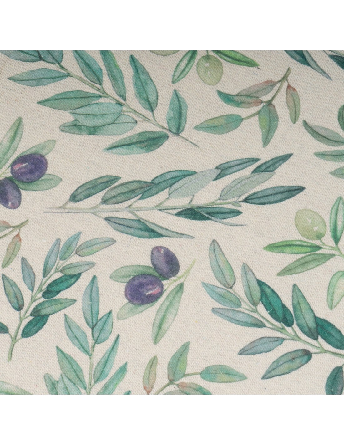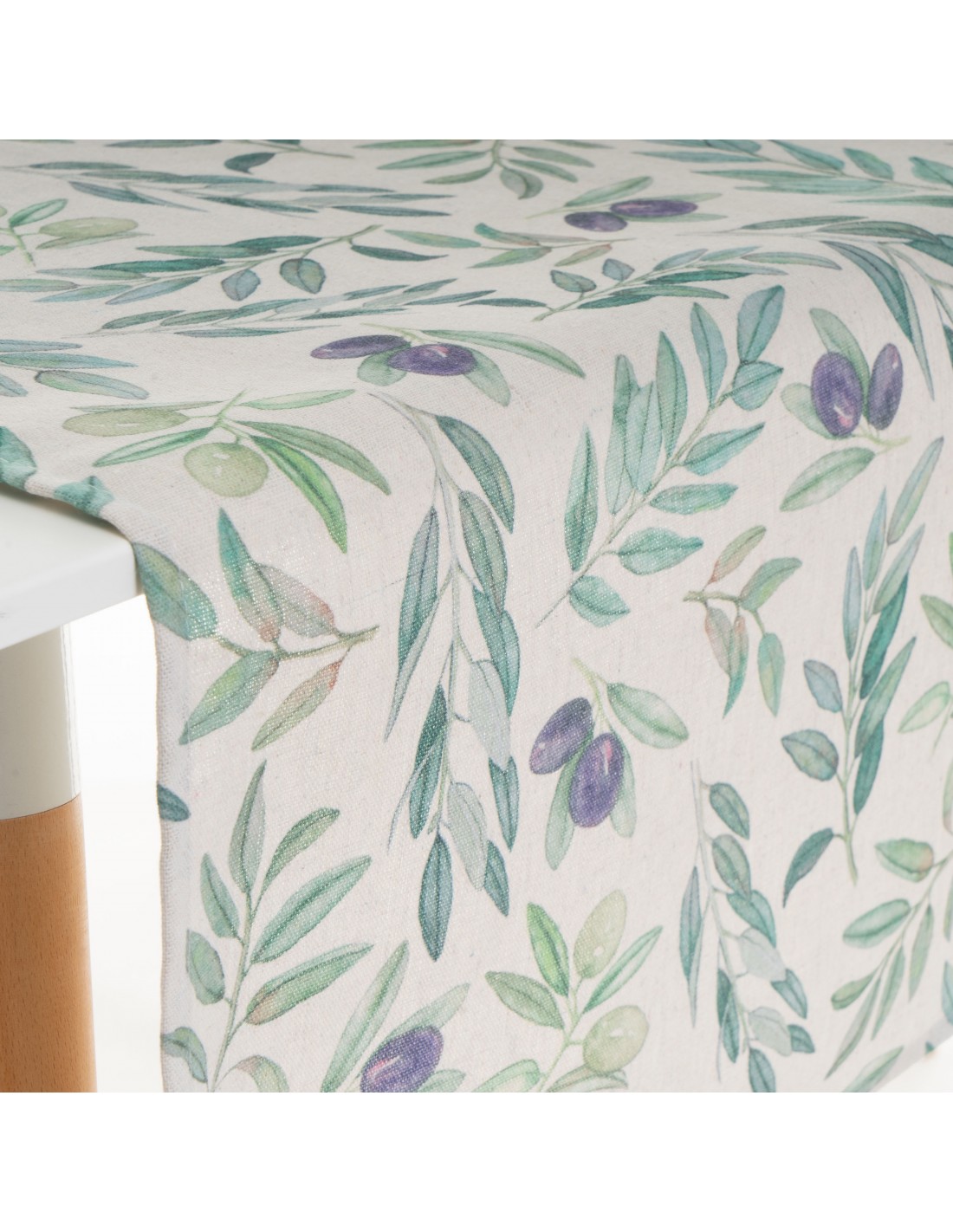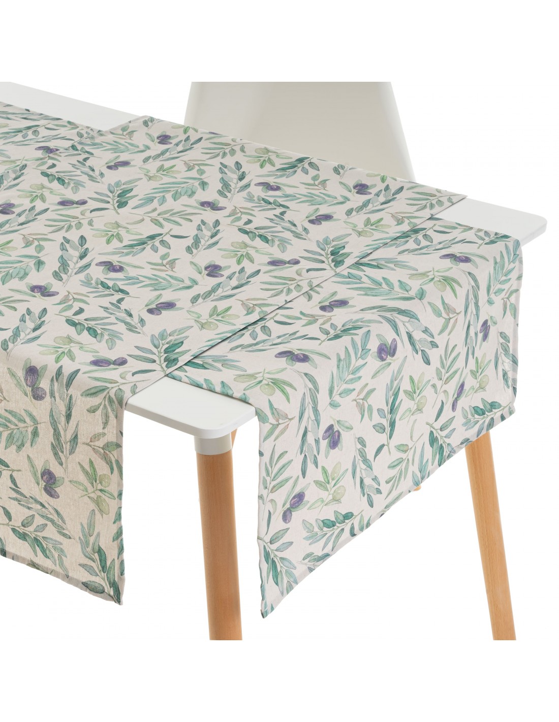 Decorativo camino de mesa con estampado de hojas y ramas de olivo en tonos suaves sobre fondo natural.