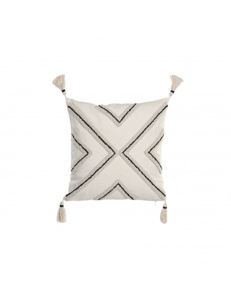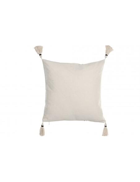 Su diseño geométrico en tonos neutros y las borlas en las esquinas lo llenan de personalidad.