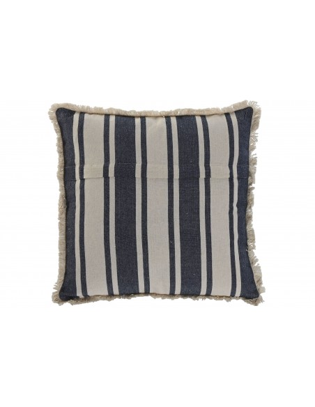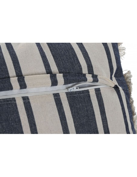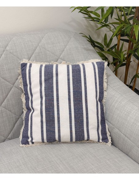 Este cojín de algodón a rayas en tonos azul y beige es perfecto para dar un toque rústico y acogedor a cualquier espacio.