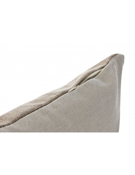 Cojín decorativo con una cara con diseño abstracto en tonos beige, azul y marrón, y el reverso liso en color natural.
