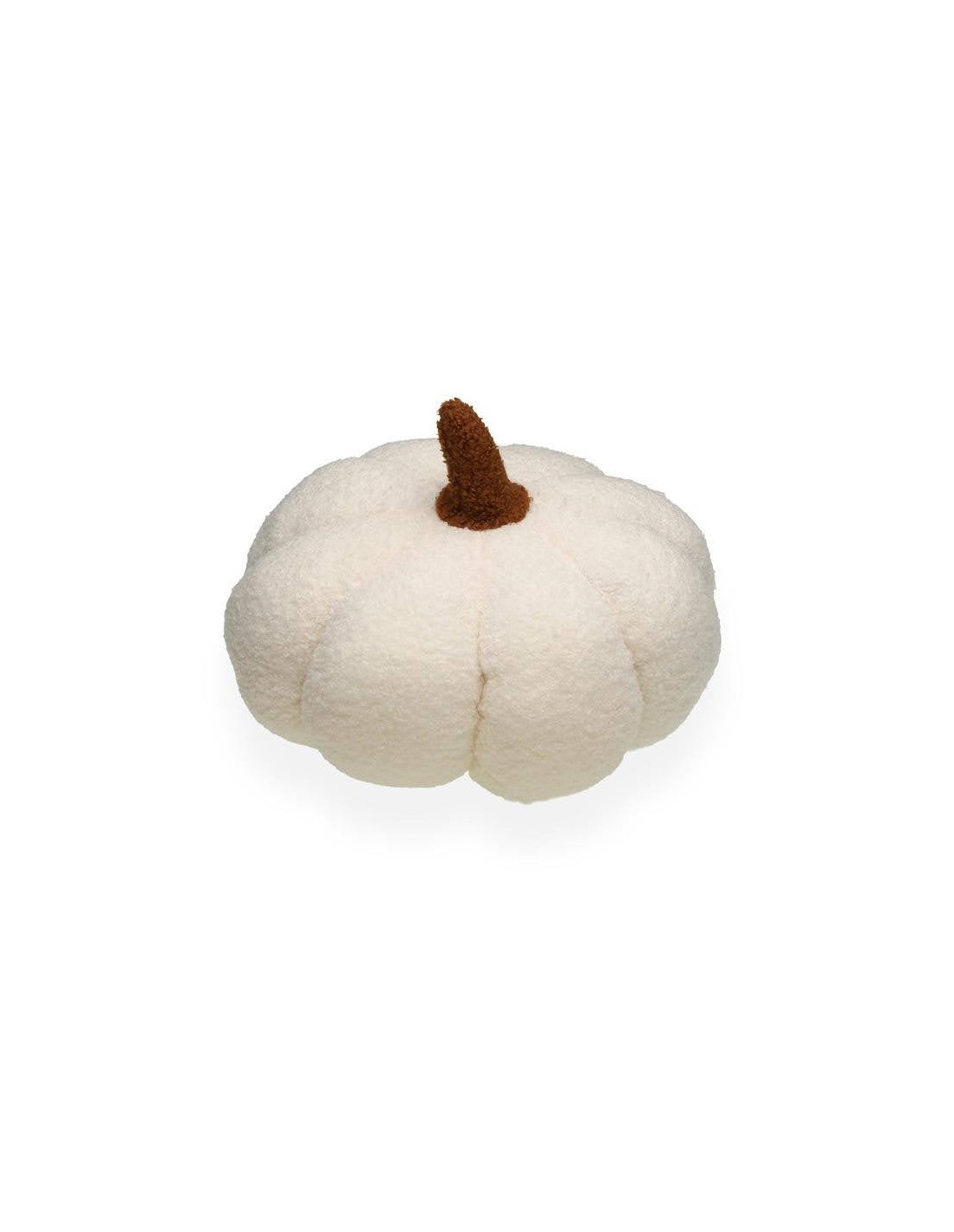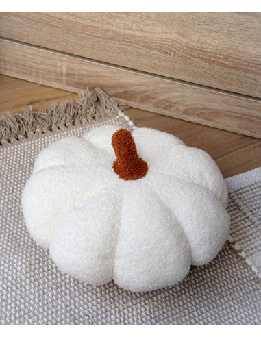 Original cojín decorativo con forma de calabaza, confeccionado en tejido tipo borreguito blanco y detalle superior en tono marrón.