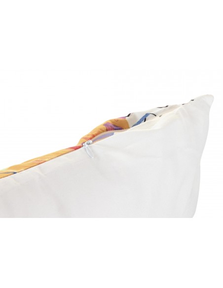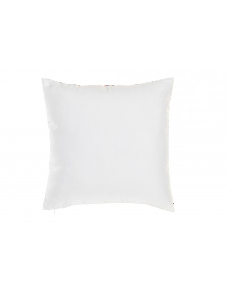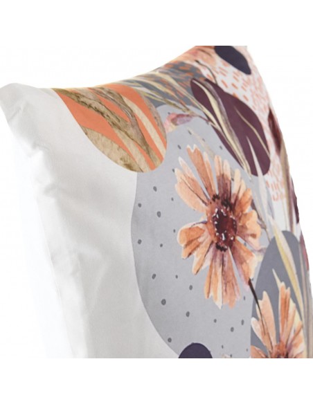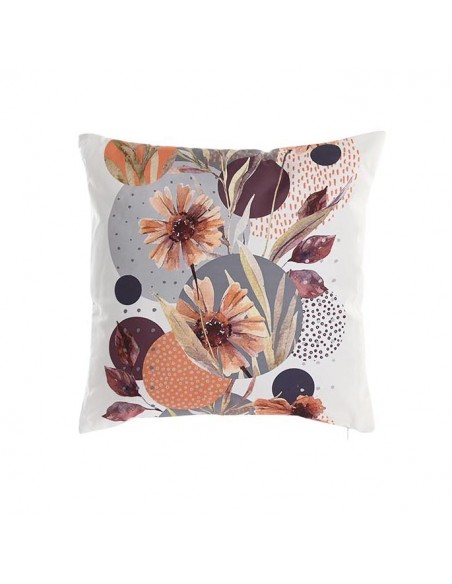 Cojín cuadrado de tela de poliester en color blanco con un original abtrascto de flores y circulos en tonos muy otoñales por su parte delantera y liso en la parte trasera.
