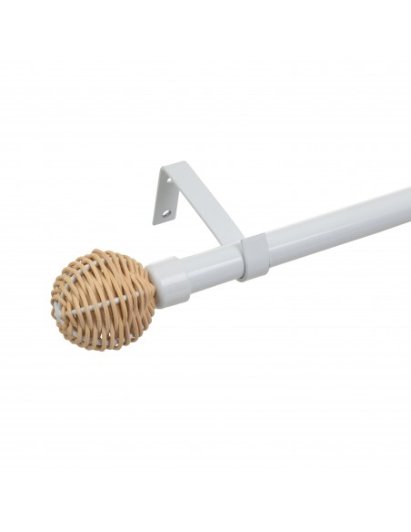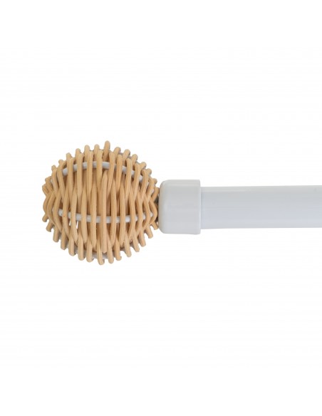Práctica barra de cortina extensible en color blanco con remate en forma de bola trenzada en tono natural.