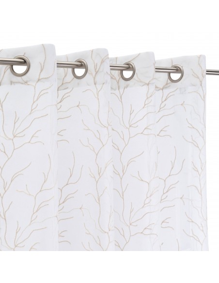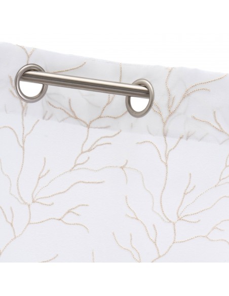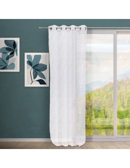Cortina visillo con tela semitransparente y delicado diseño bordado. Ojales metálicos para una instalación rápida y sencilla.