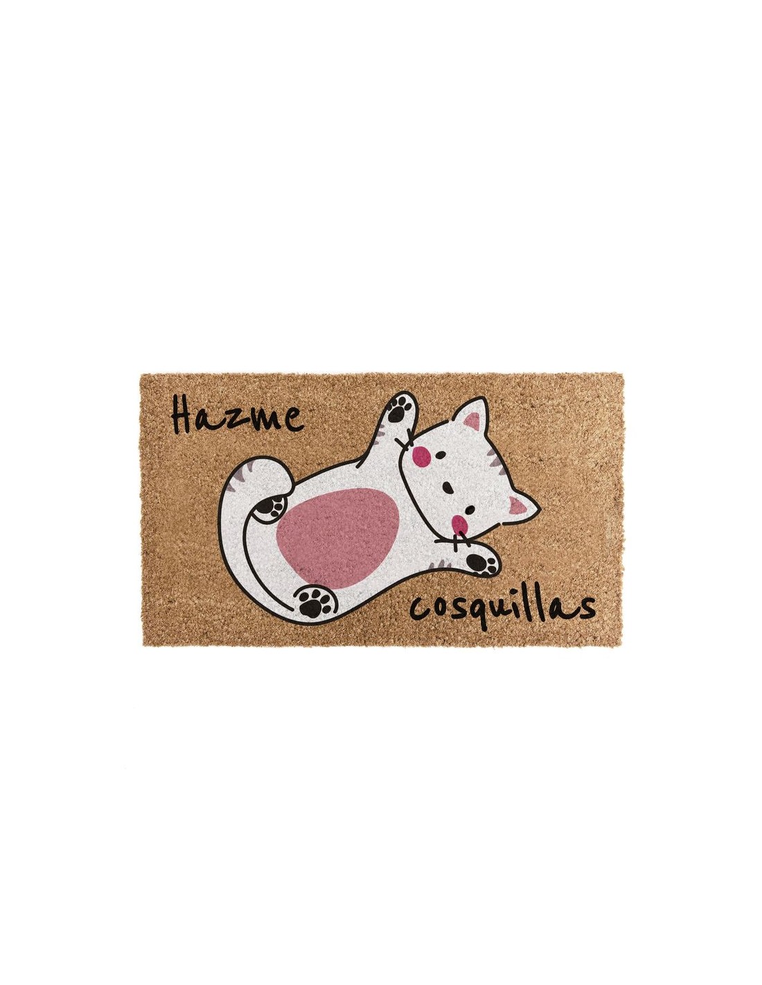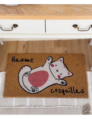 Divertido felpudo de fibra de coco con la ilustración de un gato panza arriba y la frase “Hazme cosquillas”.