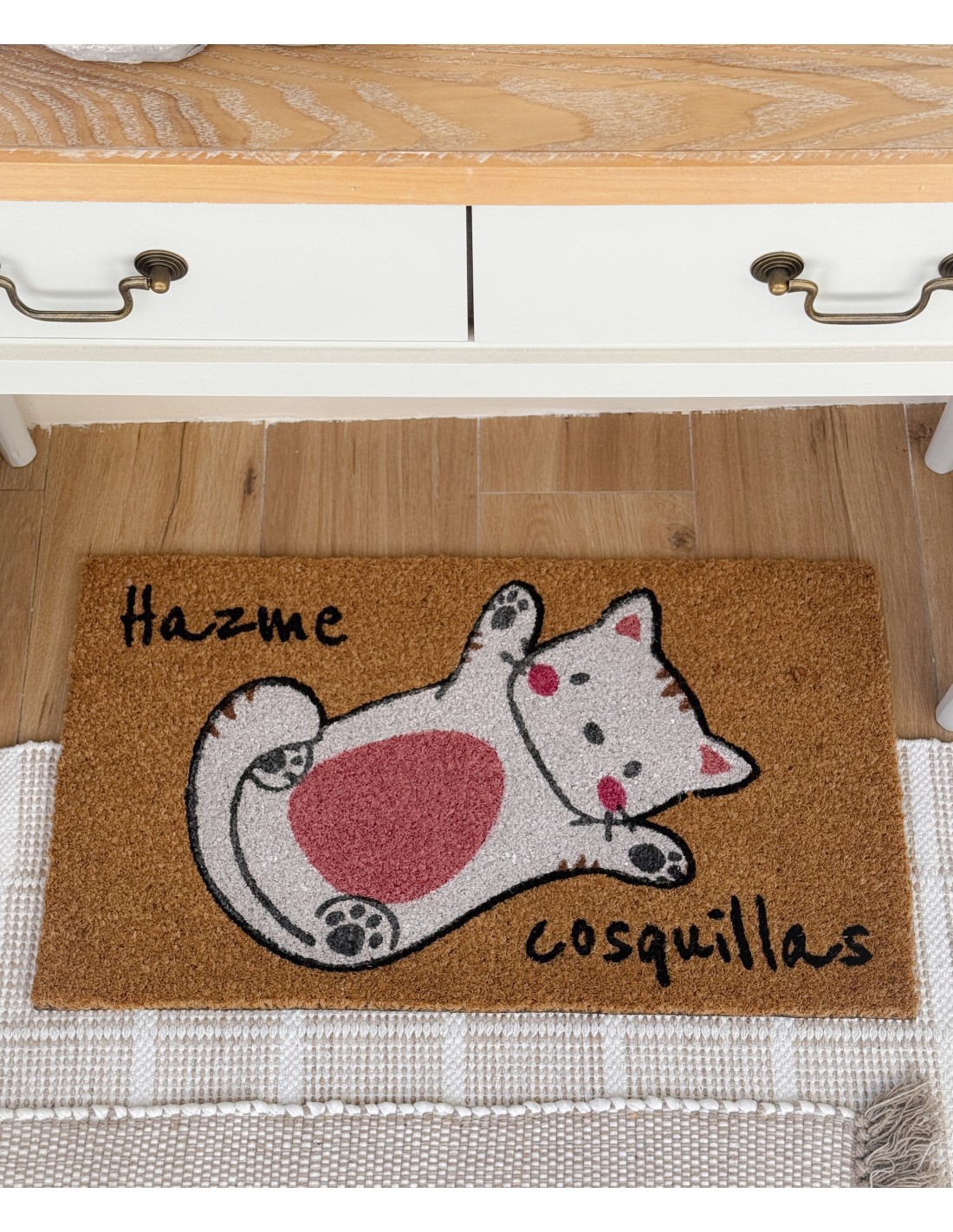 Su textura natural limpia fácilmente el calzado y aporta un toque simpático desde la entrada.