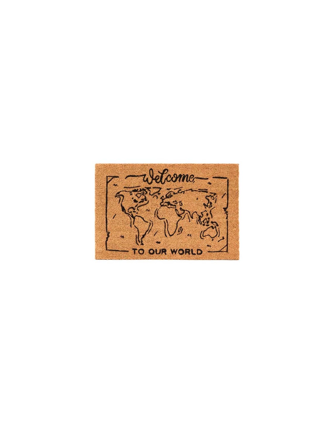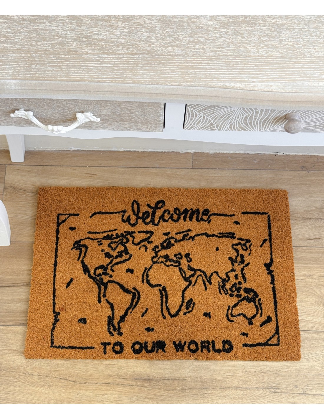 Original felpudo de coco natural con diseño de mapa del mundo y mensaje “Welcome to our world”.