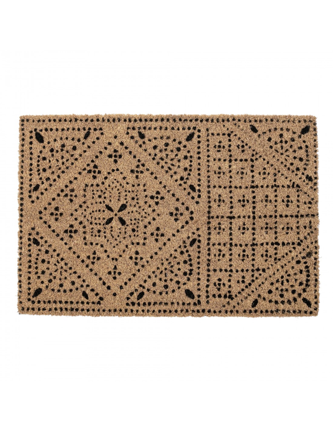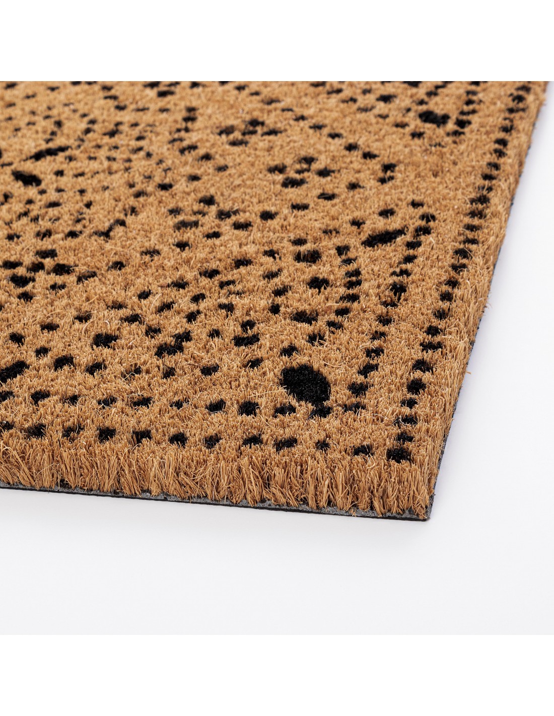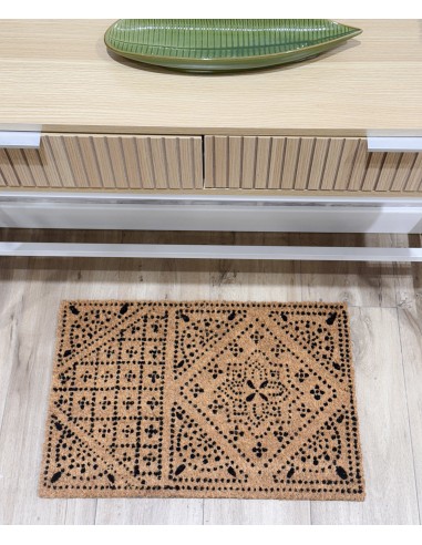 Bonito felpudo de fibra coco en tonos naturales con estampado geométrico en negro, perfecto para vestir la entrada con un aire elegante y original.