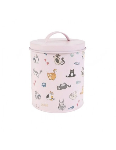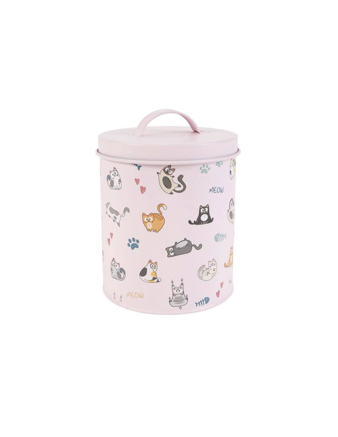 Bote metálico con tapa y estampado de divertidos gatitos en distintas posturas, acompañado de pequeños detalles como huellas, corazones y peces.