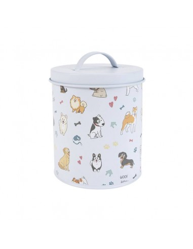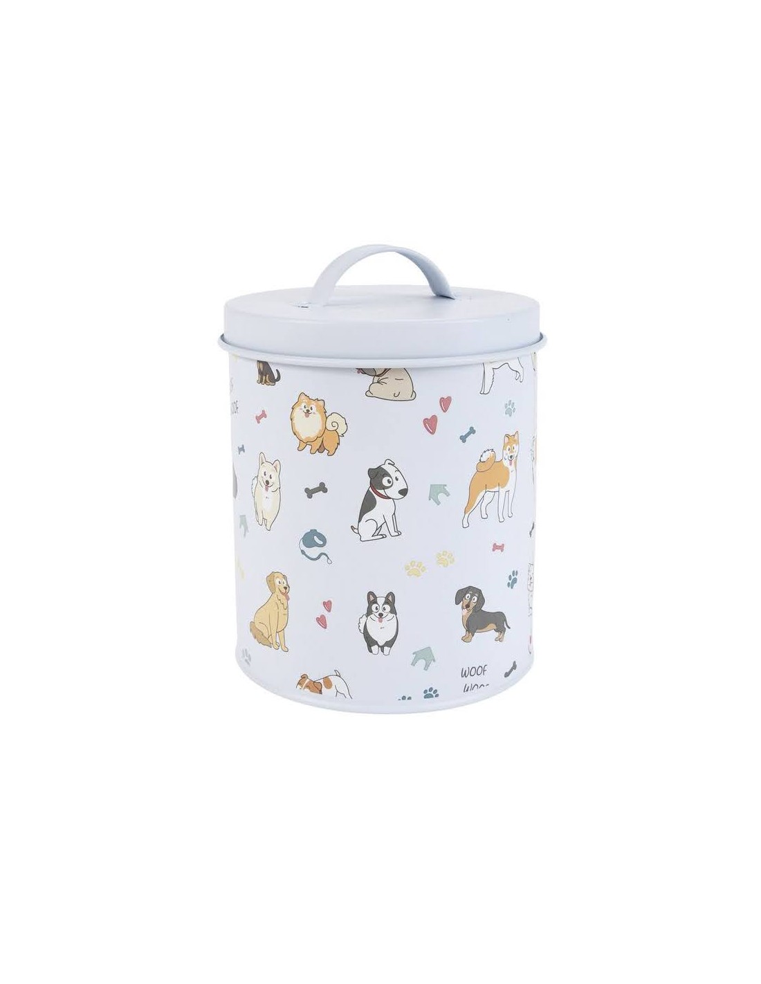 Bote metálico con tapa y divertido estampado de perros de distintas razas acompañado de pequeños iconos como huellas, huesos y corazones.