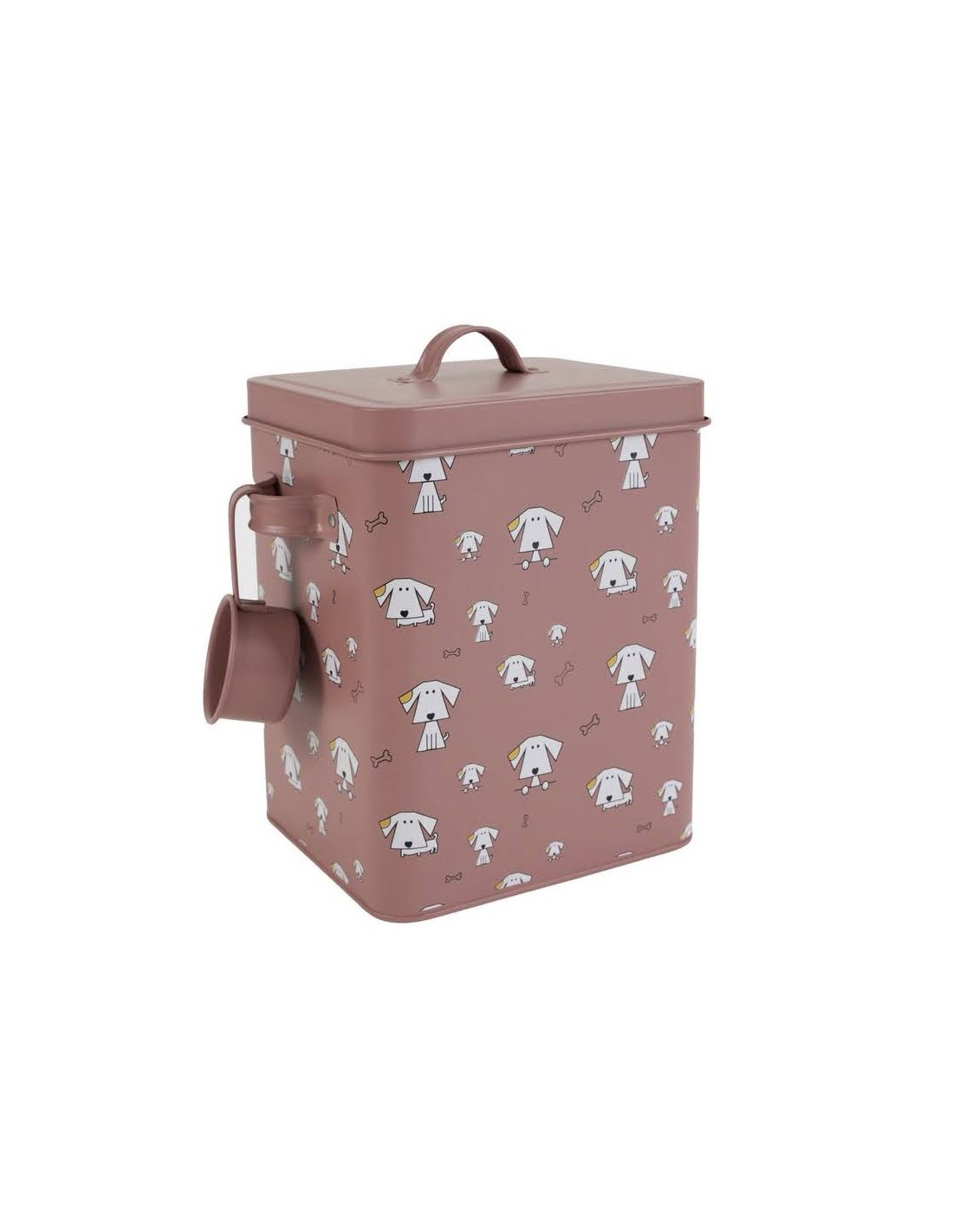Contenedor metálico con tapa, estampado de divertidos perritos y práctico cacito colgado en el lateral.