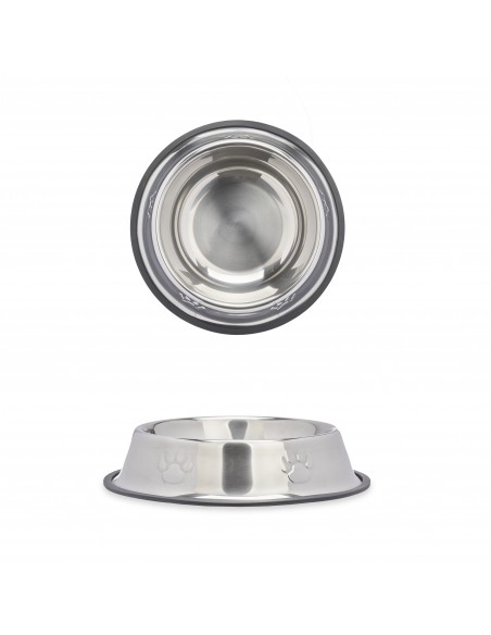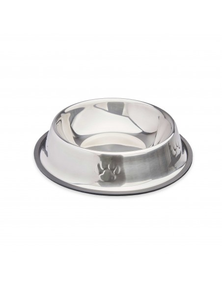 ¿Tienes mascotas en casa? Esto te encantará. Comedero de mascotas redondo metálico con una huella en la parte delantera.