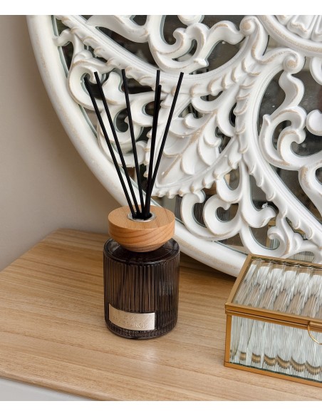 El frasco de vidrio acanalado, junto con la tapa de madera y las varillas negras, le da un aire sofisticado y decorativo.