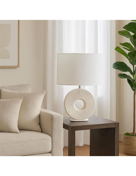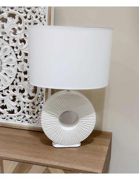 Original lámpara de mesa en color blanco con base de cerámica en forma circular calada y detalles en relieve que le aportan un diseño moderno y elegante.