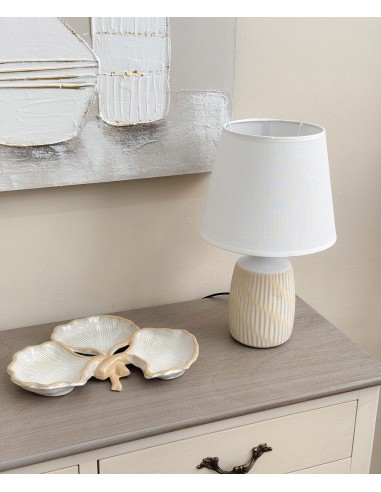 Su base de cerámica con líneas sutiles en color beige y la pantalla blanca hacen de ella una pieza versátil y moderna.