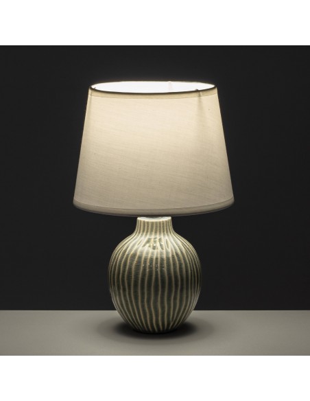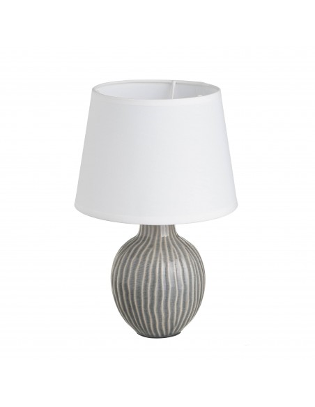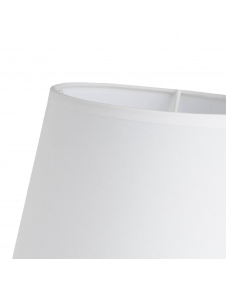 Lámpara de sobremesa con base de cerámica y pantalla textil en color blanco.
