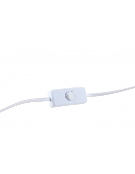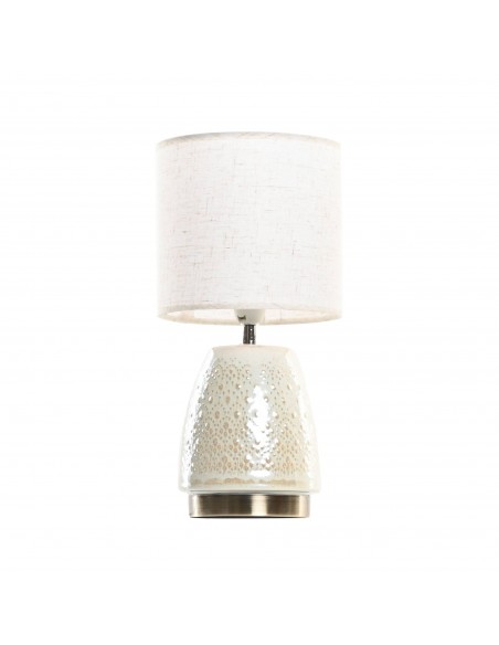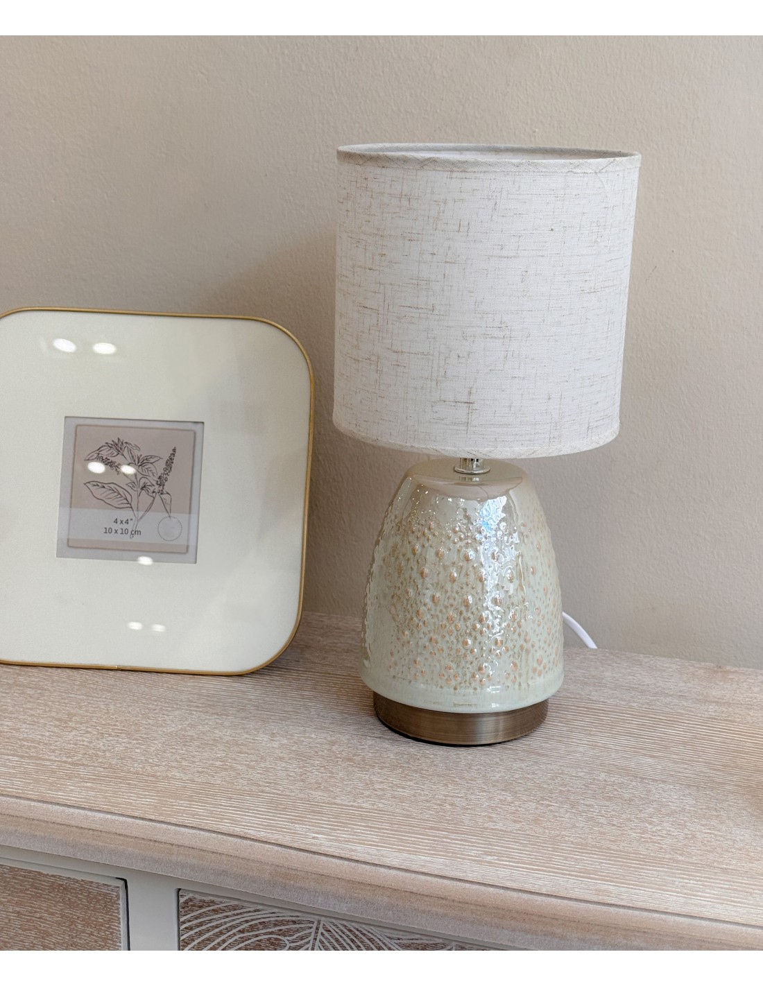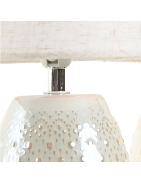 Bonita lámpara de mesa con base de cerámica blanca decorada con un delicado relieve calado y acabado brillante, rematada con una pantalla de lino en tono crudo que aporta suavidad y equilibrio.