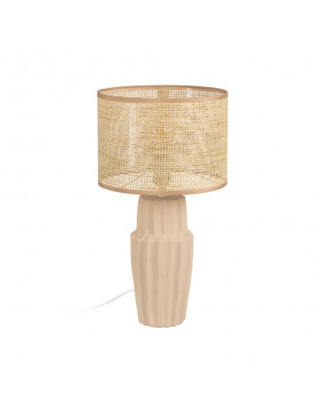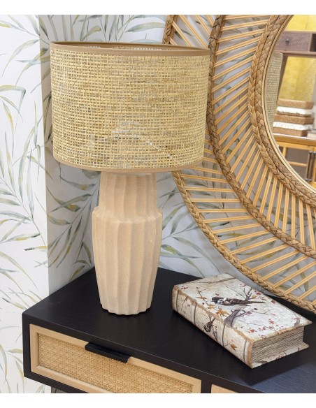 Esta lámpara de mesa combina la calidez de la cerámica con la textura natural del mimbre, creando una atmósfera acogedora en cualquier habitación.