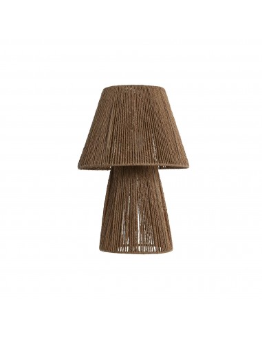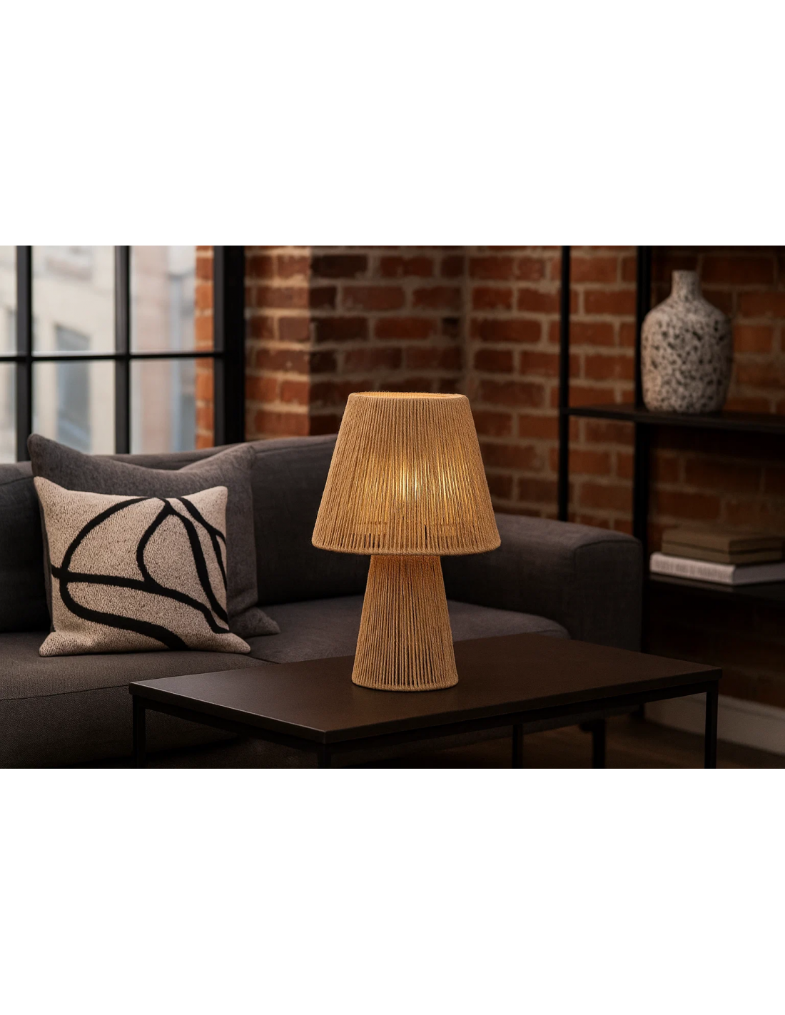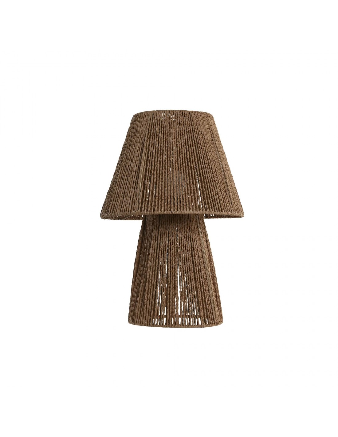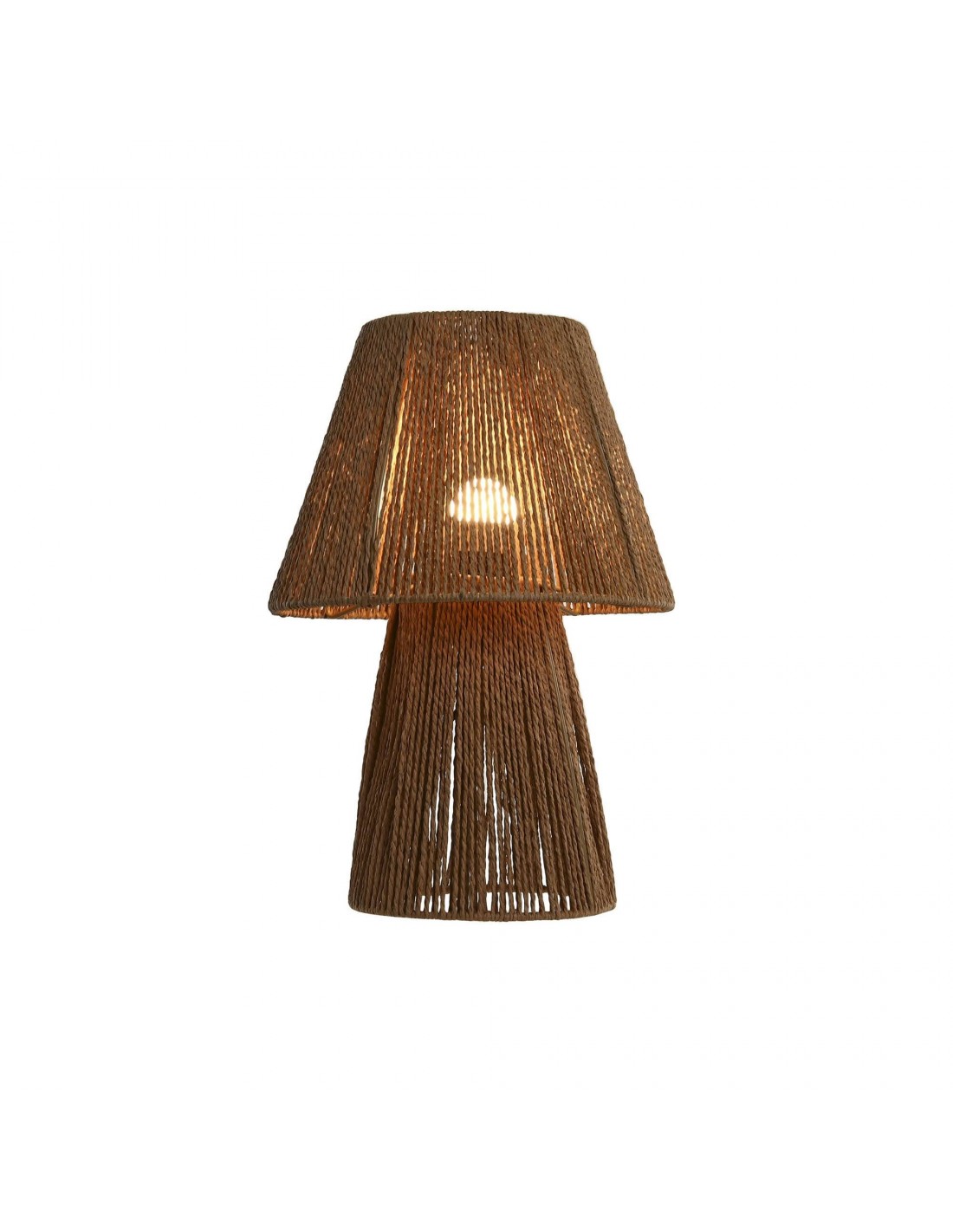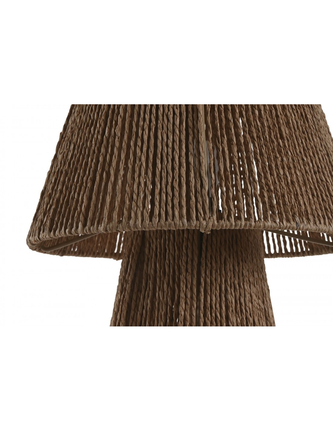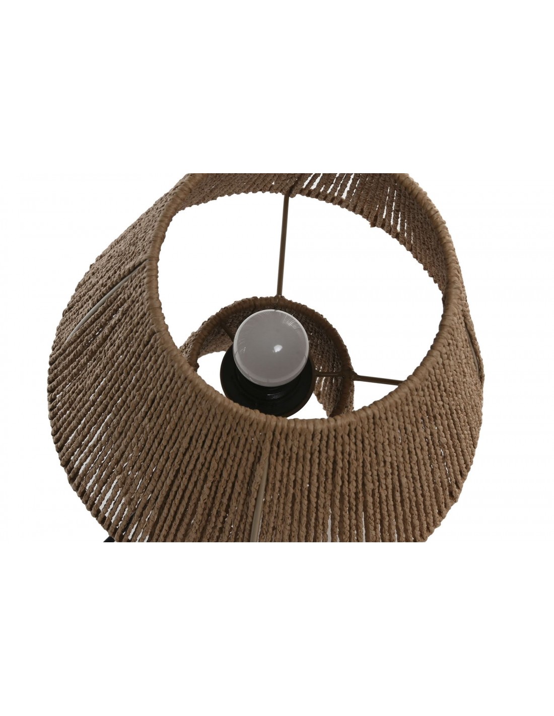 Original lámpara de mesa con estructura metálica forrada en fibra natural trenzada, de líneas verticales y diseño en forma de campana.