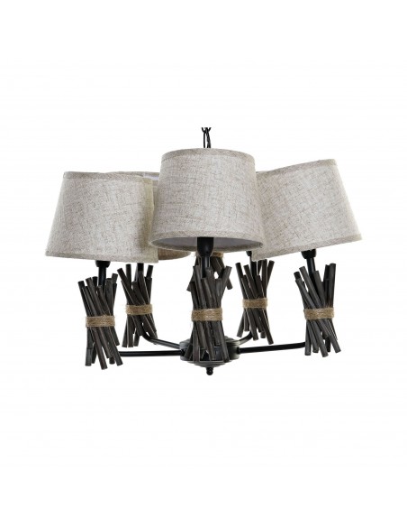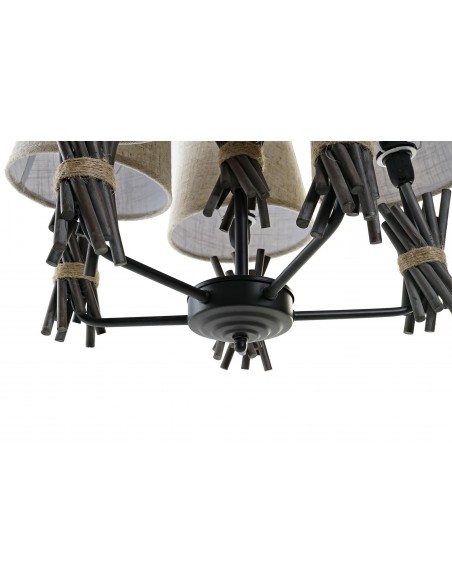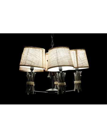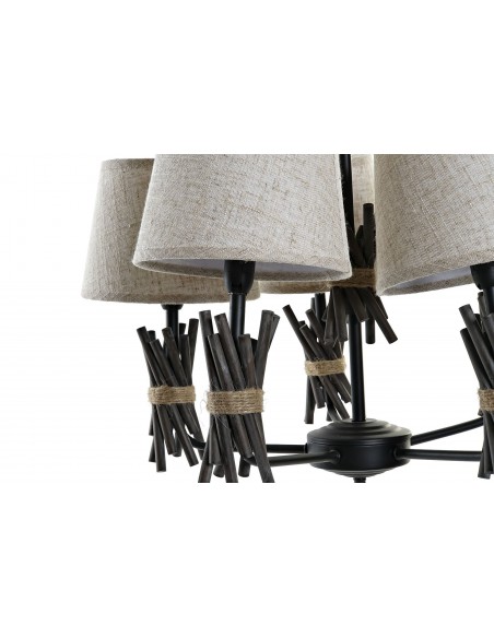 Original lámpara de techo con estructura negra mate, detalles de ramas oscuras atadas con cuerda y pantallas de lino en tono natural.