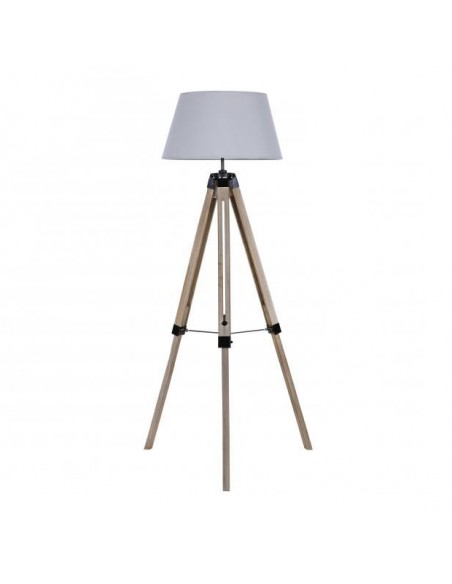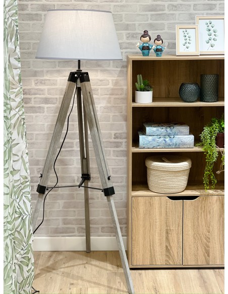 Su estructura tiene forma de trípode con tres patas ajustables fabricadas en madera natural con un toque de gris y las uniones son de metal negro.