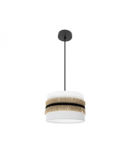 Original lámpara colgante de techo que se caracteriza por su pantalla blanca decorada en la parte central con flecos de saco de yute muy llamativos.