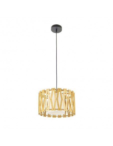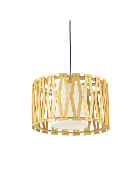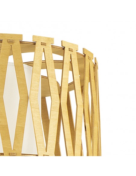 Bonita y llamativa con su doble pantalla redonda, la interior es de tela en color beige y la exterior está formada por una original estructura de madera natural con formas geométricas que aportará mucha calidez a tu hogar.