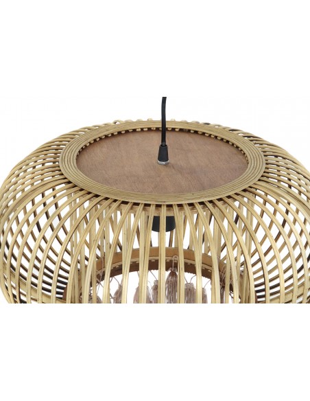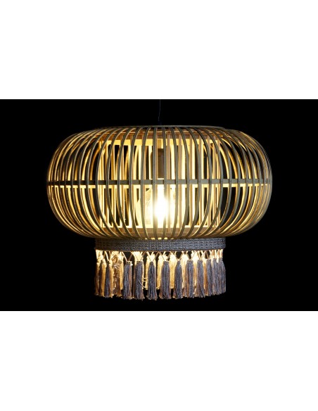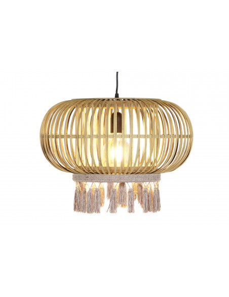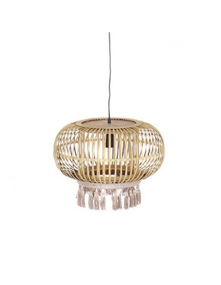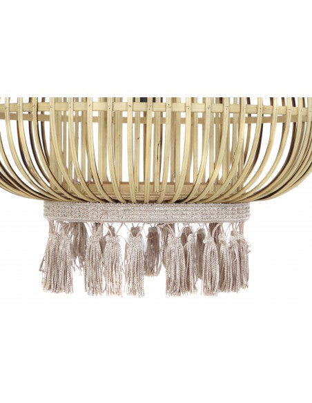 Original lámpara de techo fabricada en ratán en forma redondeada con su parte inferior decorada con borlas de flecos intercalando los colores crema y beige.