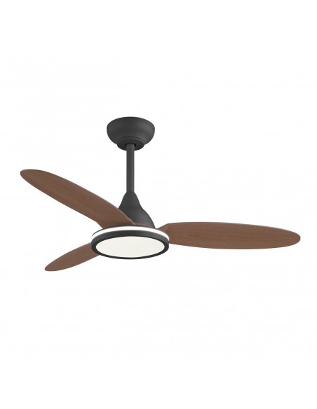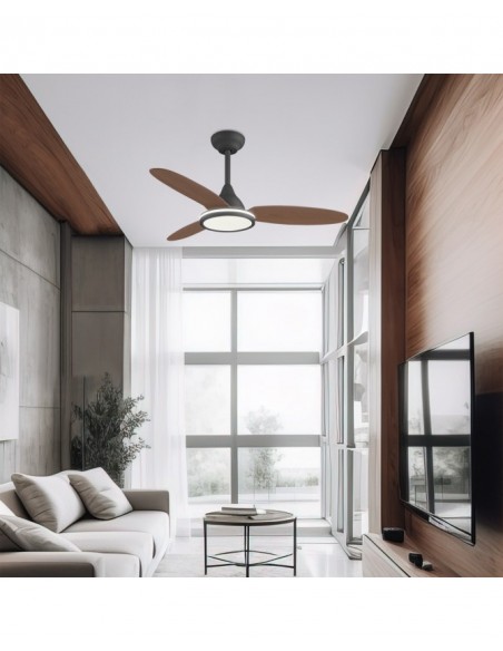 De forma redonda tiene una estructura de metal en color negro como lámpara y 3 largas aspas de acrílico imitación madera oscura