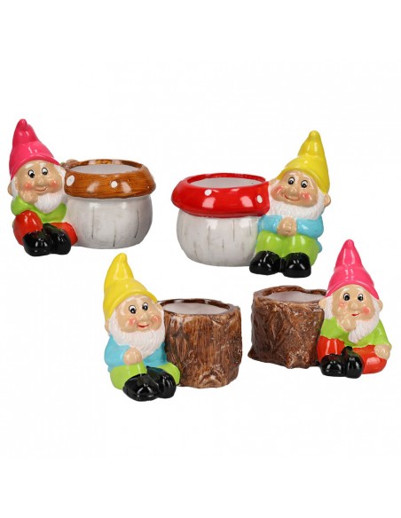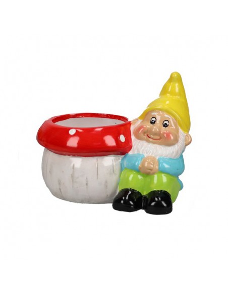Alegre macetero fabricado en cerámica con un enanito muy sonriente junto a una seta.