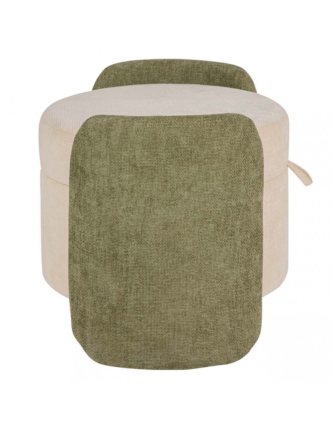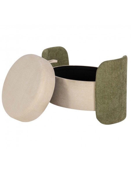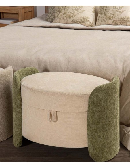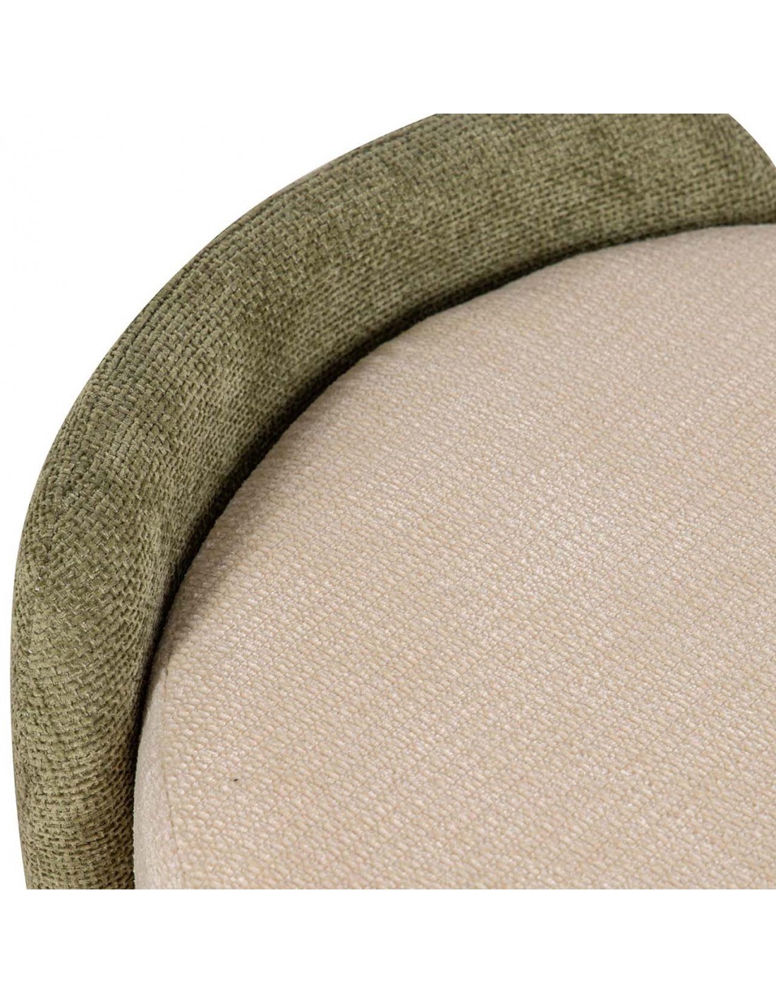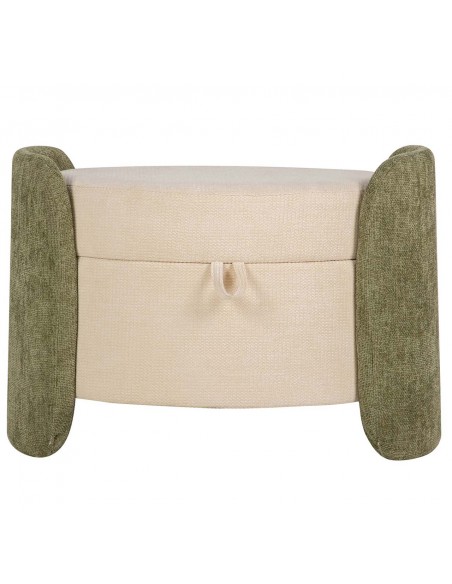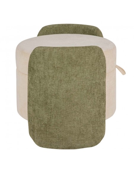 Bonita banqueta redonda fabricada en MDF y tapizada en suave velvet y chenilla beige, con originales laterales en color verde.