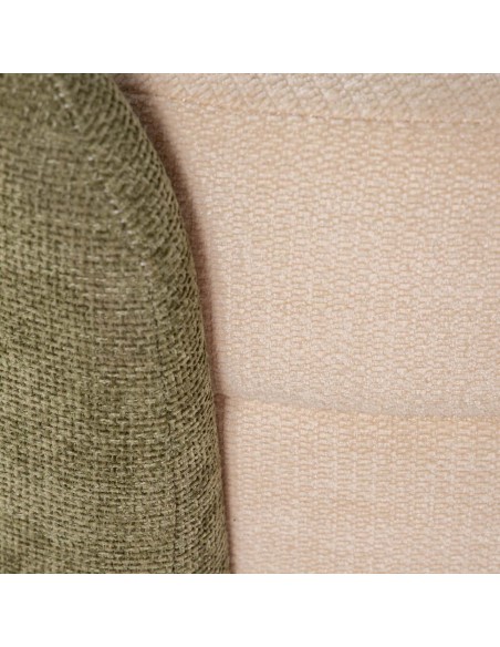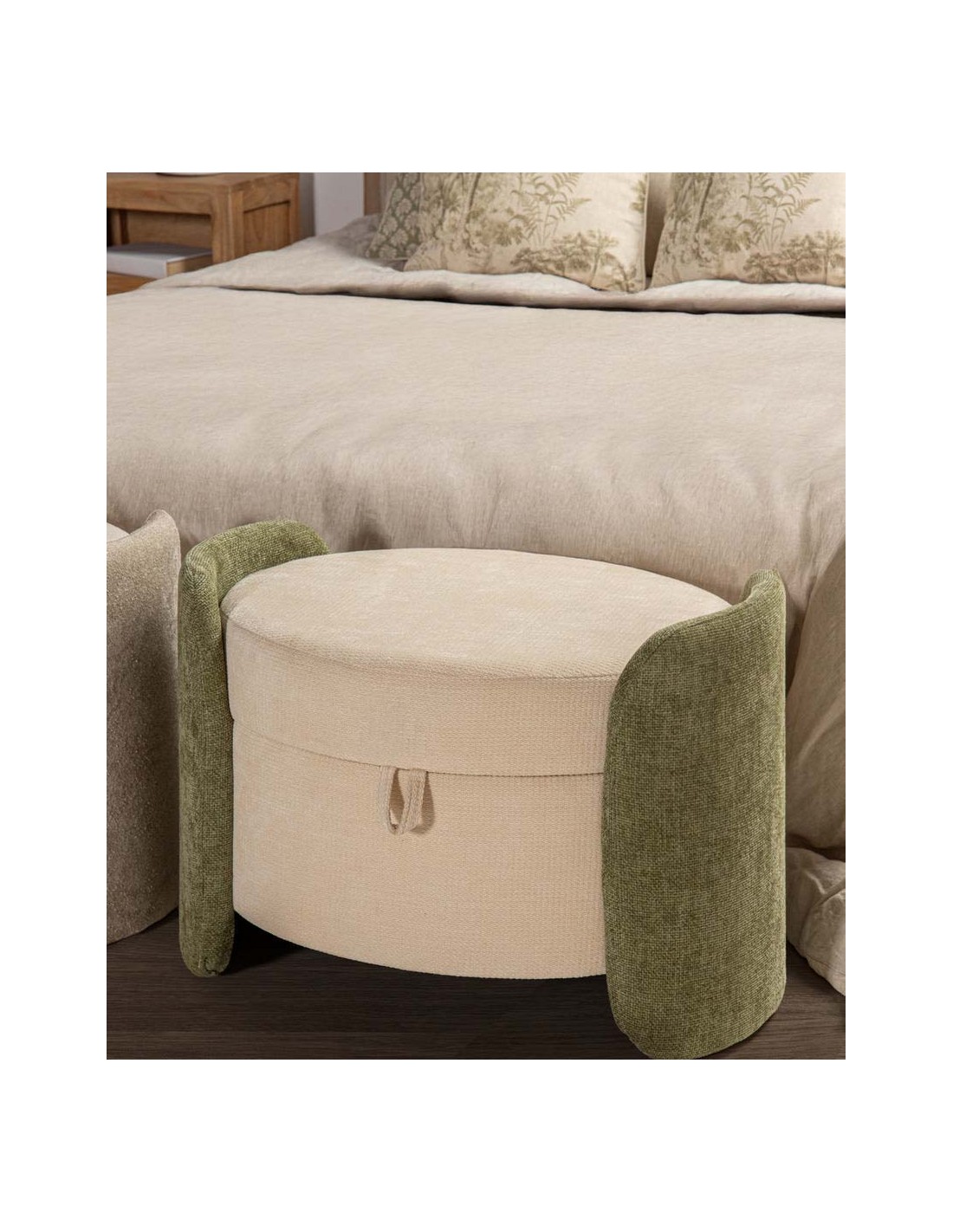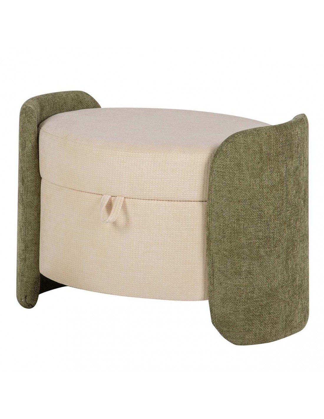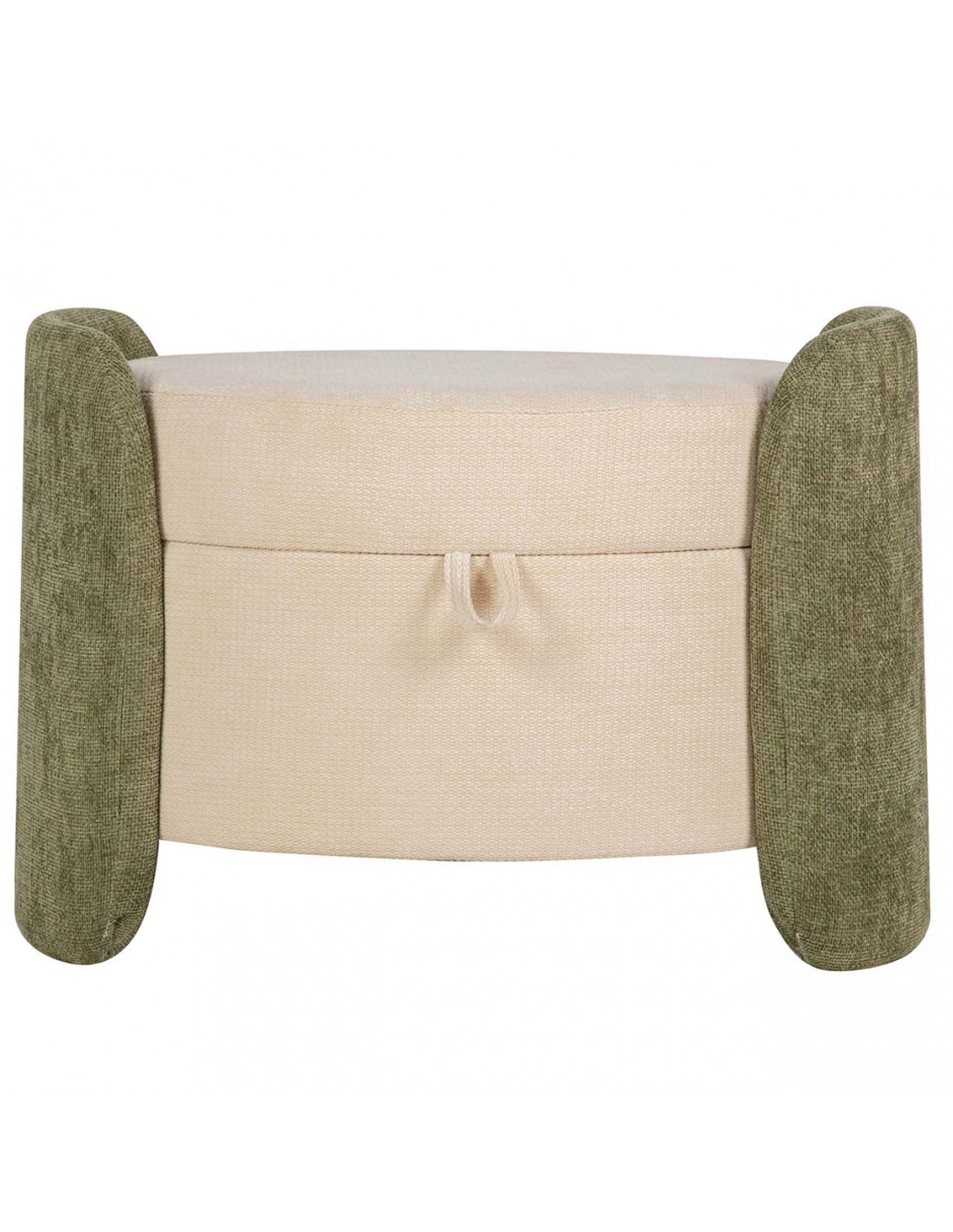 Bonita banqueta redonda fabricada en MDF y tapizada en suave velvet y chenilla beige, con originales laterales en color verde.