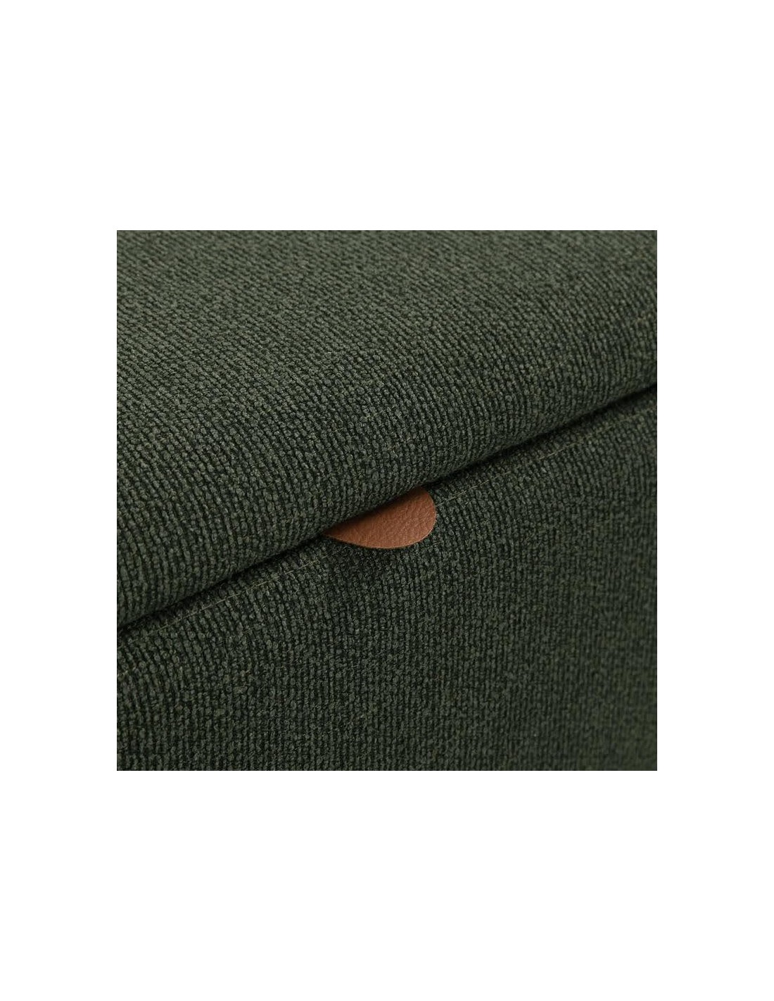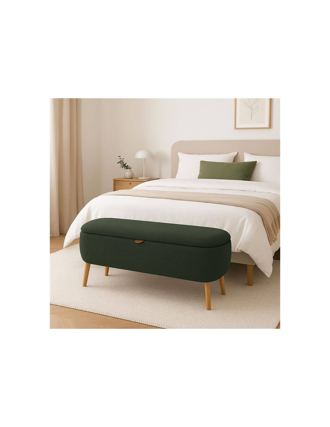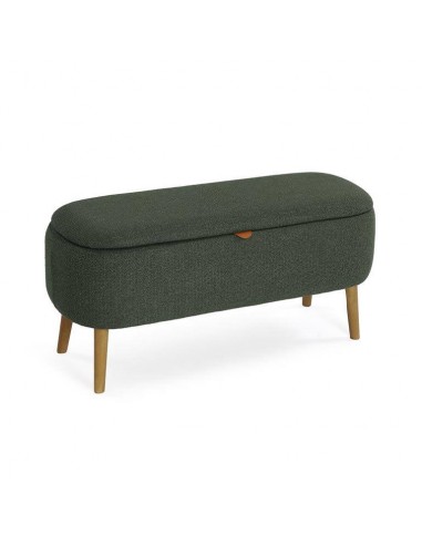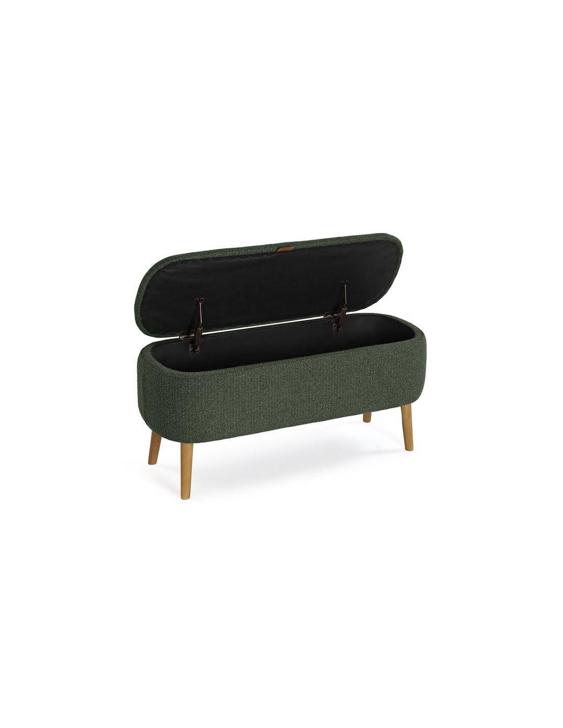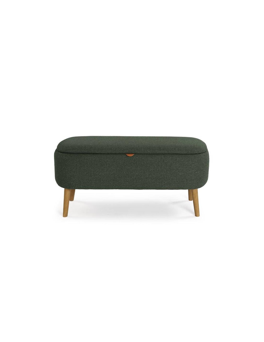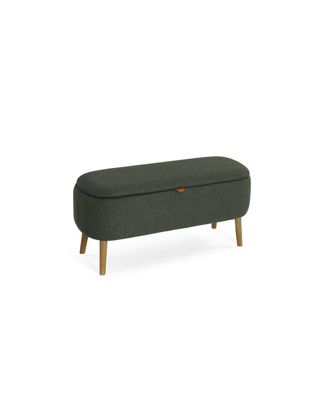 Práctica banqueta tapizada en color verde, con un diseño suave y redondeado que aporta calidez y estilo a cualquier estancia. Sus patas en tono madera clara realzan su aire natural y acogedor.