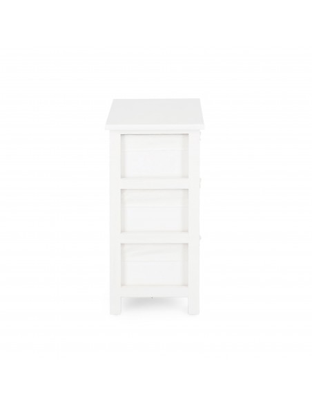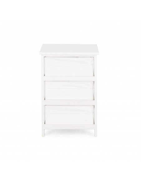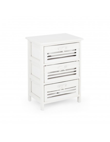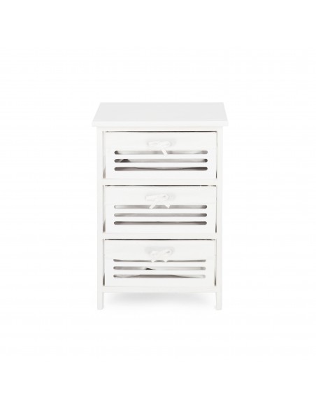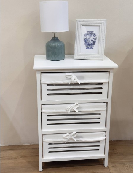 Bonita cajonera en color blanco con tres cajones tipo baúl, decorados con ranuras horizontales y un detalle de lazo en el frente.