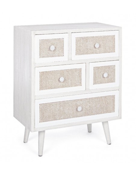 Las patas tienen formato cónico y dispone de cinco prácticos cajones en dos tamaños diferentes para almacenar tus cositas en su interior. Ideal para colocar en la habitación como sinfonier para guardar todas tus cositas, en el salón como aparador o como mueble recibidor.