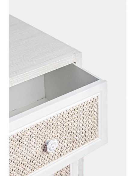 Los cajones, de madera mdf, tienen el borde de color blanco, son fácilmente manipulables, con tiradores de pomo también en blanco y frontales de rejilla natural.