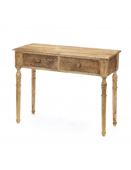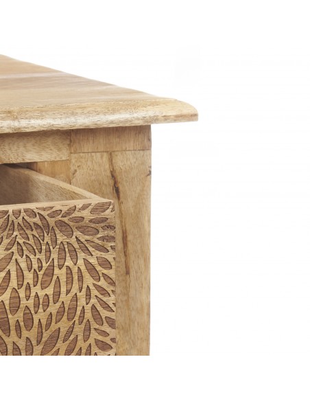 Tiene una amplia encimera y 2 anchos cajones con tiradores del mismo material aunque lo más único es el tallado de hojas en la parte delantera.