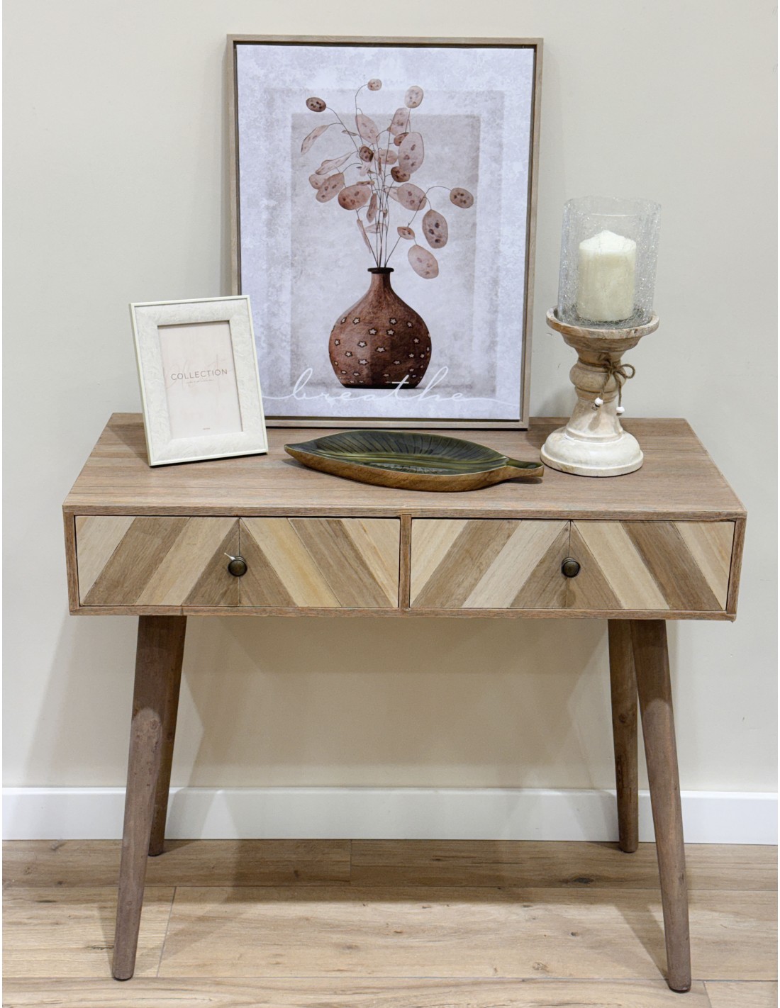 Consola de madera con un diseño escandinavo que mezcla acabados en madera clara y detalles geométricos en el frontal de sus 2 cajones, esta pieza es ideal para cualquier espacio que necesite un toque de calidez natural. Sus patas altas y estilizadas le dan una ligereza visual perfecta para no recargar el ambiente.