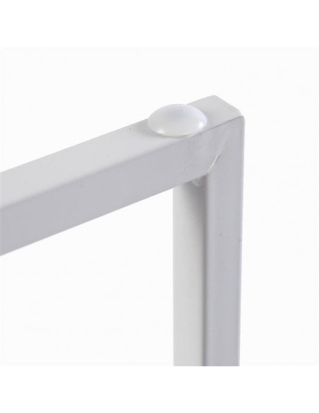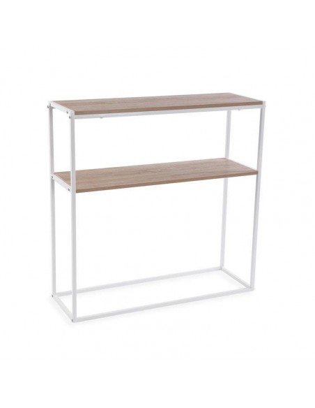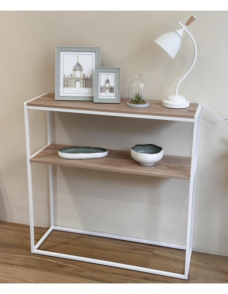 Esta original consola destaca por su diseño ligero y moderno, con estructura blanca metálica de líneas rectas y dos baldas en acabado madera natural.